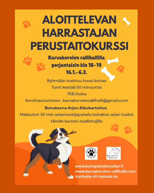 Aloittelevan harrastajan perustaitokurssi keskittyy kurssille osallistuvien tarpeiden mukaan perustaitojen vahvistamiseen. Bonuksena osallistujille tarjotaan Koirapalvelu Collanin Arjen Alkukartoitus. Arjen Alkukartoitus on maksuton 30 minuutin asiantuntijapuhelu, jossa kartoitetaan koirakon nykytilanne, arjen haasteet ja omistajan tavoitteet.