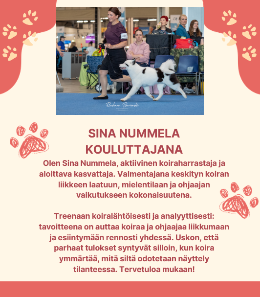 Elisa Pulkkinen on toko-kouluttaja, joka harrastaa itse mm. tokoa, hakua, pekoa, mondioringia ja vetolajeja. Kouluttamisen lisäksi Elisa työskentelee valokuvaajana. Lisää tietoja löydät Elisan nettisivulta: